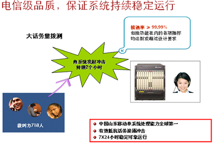 華為聯(lián)絡(luò)中心系統(tǒng)具有高穩(wěn)定性、高可靠性、易擴(kuò)展性和可維護(hù)性。這主要源于華為對電信網(wǎng)絡(luò)現(xiàn)狀與演進(jìn)的理解,源于華為擁有固定、移動和IP三個網(wǎng)絡(luò)方面綜合實(shí)力。華為數(shù)以千計的核心平臺開發(fā)測試人員,幾十種極端環(huán)境(如超大話務(wù)量、溫差、濕度、鹽堿度、缺氧等),磨礪出的是世界級的高品質(zhì)。麥加朝圣10KM內(nèi)密集200萬移動用戶,大部分為國際漫游,整齊劃一的用戶行為,形成連日多波話務(wù)尖峰,網(wǎng)絡(luò)受不均衡沖擊,系統(tǒng)容易雪崩。使用華為方案STC連續(xù)四年征服HAJJ期間話務(wù)高峰,告別系統(tǒng)每逢朝圣就癱瘓歷史。正是繼承了這樣的DNA,我們在某移動運(yùn)營商聯(lián)絡(luò)中心系統(tǒng)單點(diǎn)實(shí)測BHCC1200K,每天平均呼叫量為600萬次,一套系統(tǒng)支撐著2000多座席和近8000路IVR。