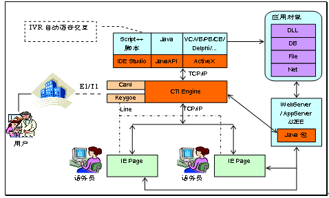 IVR部分,編寫Script++腳本程序或VC/VB/Delphi/PB/Java應用程序控制電路的接續(xù)以及放音、錄音收碼、轉(zhuǎn)移等。