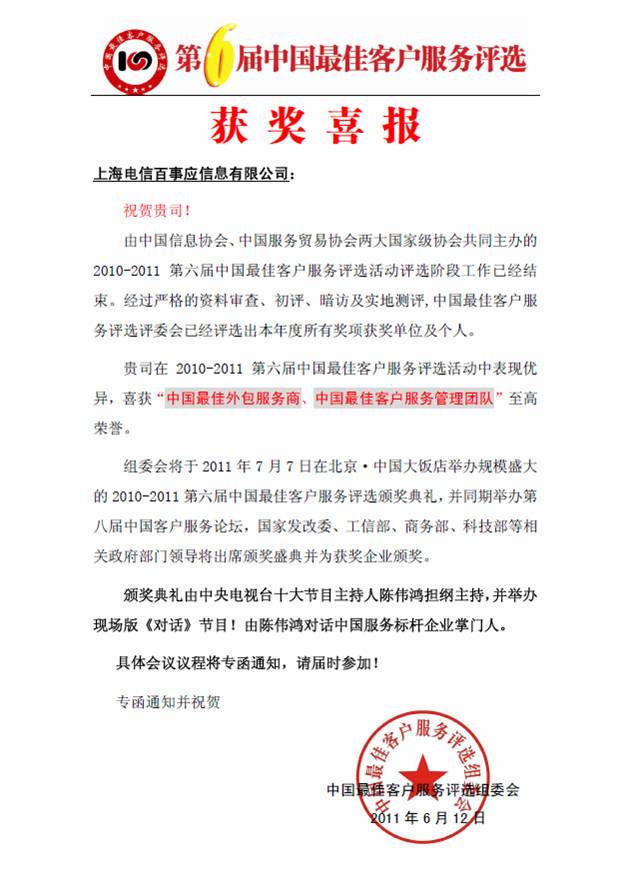 由中國(guó)信息協(xié)會(huì)、中國(guó)服務(wù)貿(mào)易協(xié)會(huì)兩大國(guó)家級(jí)協(xié)會(huì)共同主辦的2010-2011第六屆中國(guó)最佳客戶服務(wù)評(píng)選活動(dòng)評(píng)選階段工作已經(jīng)結(jié)束。經(jīng)過嚴(yán)格的資料審查、初評(píng)、暗訪及實(shí)地測(cè)評(píng),中國(guó)最佳客戶服務(wù)評(píng)選評(píng)委會(huì)已經(jīng)評(píng)選出本年度所有獎(jiǎng)項(xiàng)。