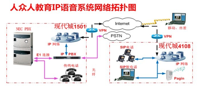 2011年12月,人眾人由于業(yè)務(wù)的發(fā)展,業(yè)務(wù)拆分為室內(nèi)業(yè)務(wù)和室外業(yè)務(wù),通過前期的交流決定采用朗泰企業(yè)通訊平臺做為人眾人的語音通訊解決方案,通過一個E1連接原有NEC交換機,使用一個E1連接PSTN提供人眾人全體人員的電話呼入和呼出,室外業(yè)務(wù)員工全部使用第三方SIP電話,原有NEC的用戶任然使用原有的模擬電話,將逐步向SIP電話進行遷移。