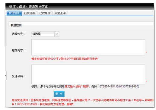 短信群發(fā)/單發(fā)、傳真群發(fā)、TTS語(yǔ)音群發(fā)(通過(guò)第三方平臺(tái)和接口)(需開通賬號(hào))
