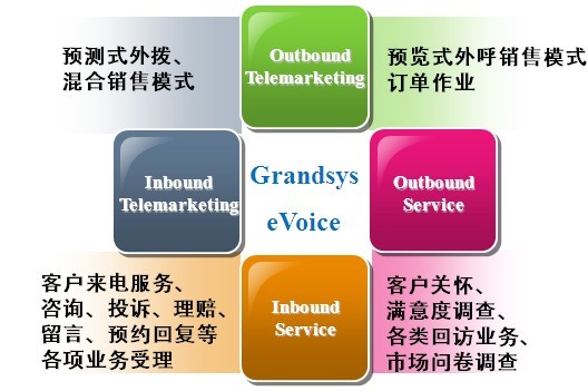 Grandsys eVoice8300電銷與客服系統(tǒng),提供企業(yè)一次到位的電話營銷與客戶服務管理平臺;本系統(tǒng)涵蓋呼叫中心日常的各項工作,包含:客戶來電服務、外撥營銷、客戶關懷、訂單服務、問卷調查…等,整體工作流程透過系統(tǒng),進行完整便捷的操作及記錄,讓電話營銷與客戶服務活動進行地更加流暢,讓客戶更為滿意??冃Х治雠c報表功能,可幫助企業(yè)進行策略分析與擬定作戰(zhàn)計劃,自此呼叫中心不再僅是成本中心,更晉升為企業(yè)戰(zhàn)情中心。