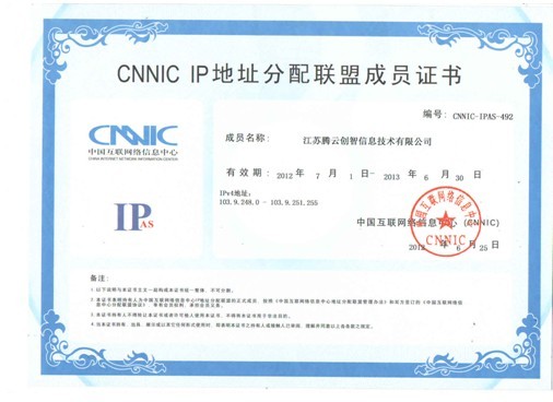 近日,江蘇騰云創(chuàng)智信息技術(shù)有限公司成為CNNIC(中國互聯(lián)網(wǎng)信息中心)IP地址分配聯(lián)盟成員,獲得CNNIC頒發(fā)的成員證書。