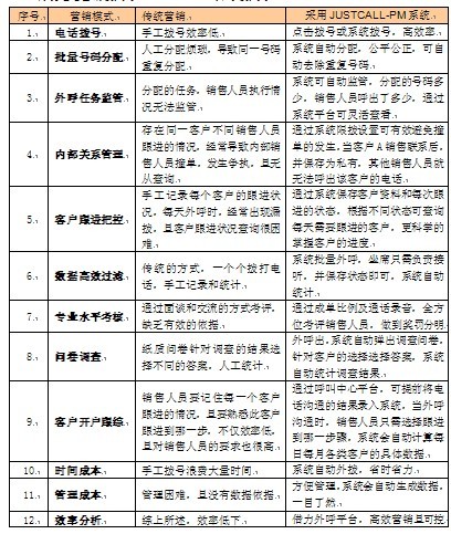 傳統(tǒng)電話(huà)營(yíng)銷(xiāo)模式與JUSTCALL-PM外呼模式對(duì)比:
