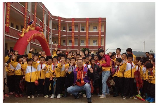 圖2:飛翱集團主席及行政總裁黃有權先生(中間)與鄉(xiāng)下村小學熱情的同學們