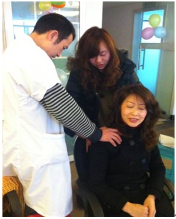 按摩師在指導(dǎo)客服部李思微給家長按摩穴位