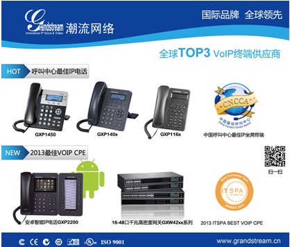 4月18-19號(hào), 全球Top 3 VOIP終端供應(yīng)商——潮流網(wǎng)絡(luò),將攜最新2013 ITSPA BEST VoIP CPE大獎(jiǎng)產(chǎn)品、千兆高密度網(wǎng)關(guān)GXW42xx、高清GXP IP電話系列亮相在上海舉辦的2013中國(guó)客戶聯(lián)絡(luò)中心與BPO產(chǎn)業(yè)大會(huì),屆時(shí)與VOIP行業(yè)專家、合作伙伴共同分享業(yè)界領(lǐng)先的最新產(chǎn)品和高品質(zhì)創(chuàng)新解決方案,歡迎各位新老朋友關(guān)注。