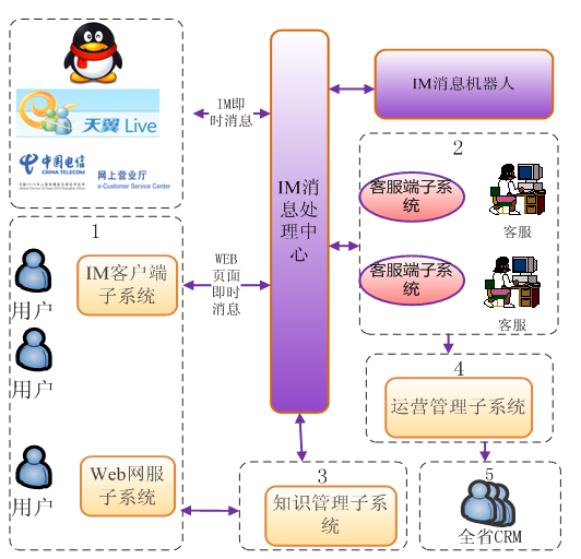 1:WEB客戶端模塊,用戶通過(guò)QQ,或者WEB網(wǎng)服子系統(tǒng)的WEB即時(shí)通信和客服人員通訊。