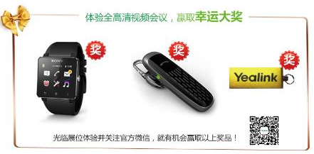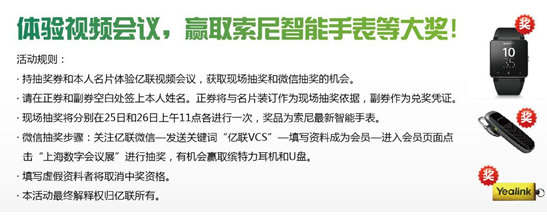 第三步:第四步光臨億聯(lián)展位(D18A)體驗(yàn)全高清視頻會(huì)議。我們將在25日和26日上午11點(diǎn),從現(xiàn)場(chǎng)體驗(yàn)并遞交名片的客戶中各抽取一名幸運(yùn)客戶,贈(zèng)送索尼SmartWatch。