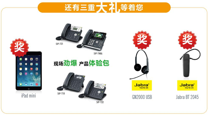 除了零距離溝通和交流,億聯(lián)還為現(xiàn)場來賓精心準備了iPad mini、Jabra耳機、億聯(lián)T46G話機等精彩獎品和億聯(lián)產(chǎn)品超值體驗包。通過億聯(lián)微信公眾賬號參與互動的來賓,更有機會贏取神秘獎品。精彩不容錯過,趕緊拿起手機關(guān)注億聯(lián)微信公眾賬號“Yealink”。