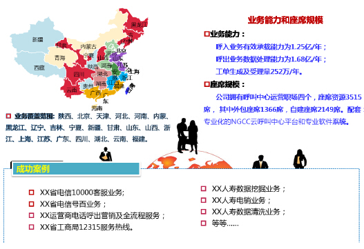 規(guī)?;暮艚兄行倪\(yùn)營職場,先進(jìn)的呼叫中心CCC云平臺系統(tǒng),專業(yè)的呼叫管理軟件系統(tǒng),穩(wěn)定的雙備份網(wǎng)絡(luò)通信資源保障,為客戶提供系統(tǒng)化的業(yè)務(wù)資源解決方案及可拆分組合的資源包。如:在座席硬件上疊加系統(tǒng)支持、業(yè)務(wù)管理軟件支撐、人員招募支持及素質(zhì)培訓(xùn)等。