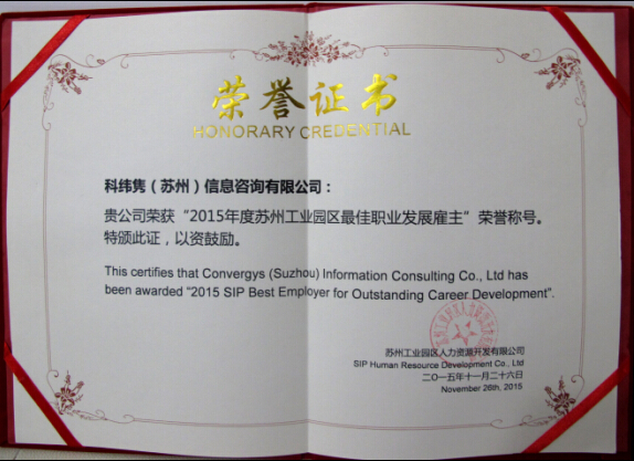 2015年11月26日,“雇主品牌建設(shè)暨2015年蘇州工業(yè)園區(qū)最佳雇主發(fā)布會”在蘇州萬怡酒店舉行。主辦方蘇州工業(yè)園區(qū)人力資源開發(fā)有限公司與蘇州工業(yè)園區(qū)人力資源管理服務(wù)中心合署宣布:全球客戶管理服務(wù)的行業(yè)領(lǐng)導(dǎo)者——科緯雋,榮獲“2015年度蘇州工業(yè)園區(qū)最佳職業(yè)發(fā)展雇主”榮譽稱號!憑借在人才培養(yǎng)、員工滿意度、企業(yè)文化建設(shè)及企業(yè)品牌建設(shè)等方面的杰出表現(xiàn),科緯雋從最終參評的80多家企業(yè)中脫穎而出,斬獲此殊榮。該榮譽不僅是對科緯雋優(yōu)秀雇主品牌的極大認(rèn)可,同時也是對該企業(yè)積極打造人才培養(yǎng)文化的最佳證明。