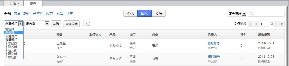 在Smart Call的管理系統(tǒng)中,后臺(tái)可以按照部門(mén)來(lái)劃分不同的團(tuán)隊(duì)。在【開(kāi)始】—“市場(chǎng)與銷(xiāo)售”—【客戶(hù)】— [團(tuán)隊(duì)] 界面,根據(jù)權(quán)限的不同,可以看到所屬部門(mén)、下屬部門(mén),或公司架構(gòu)中其他部門(mén)所擁有的客戶(hù)數(shù)據(jù)資料。