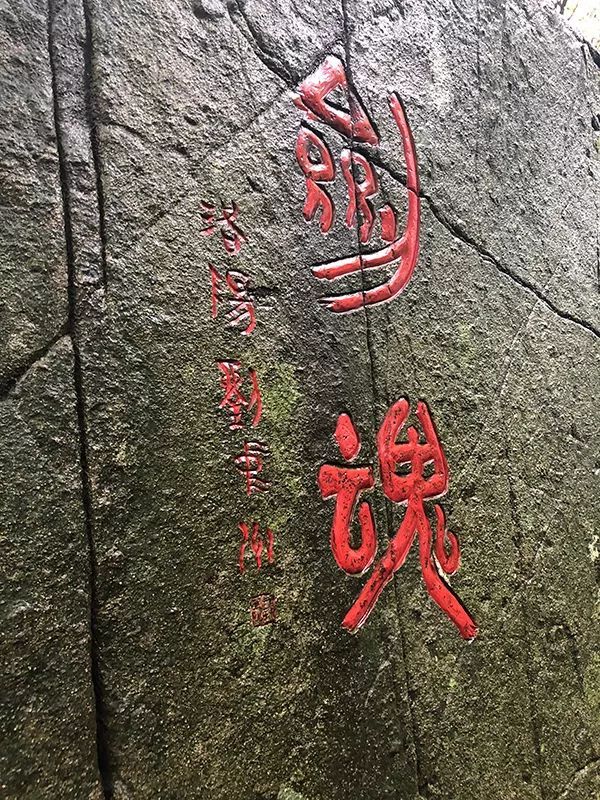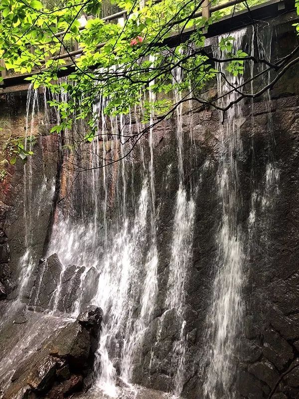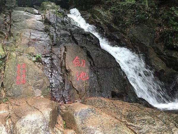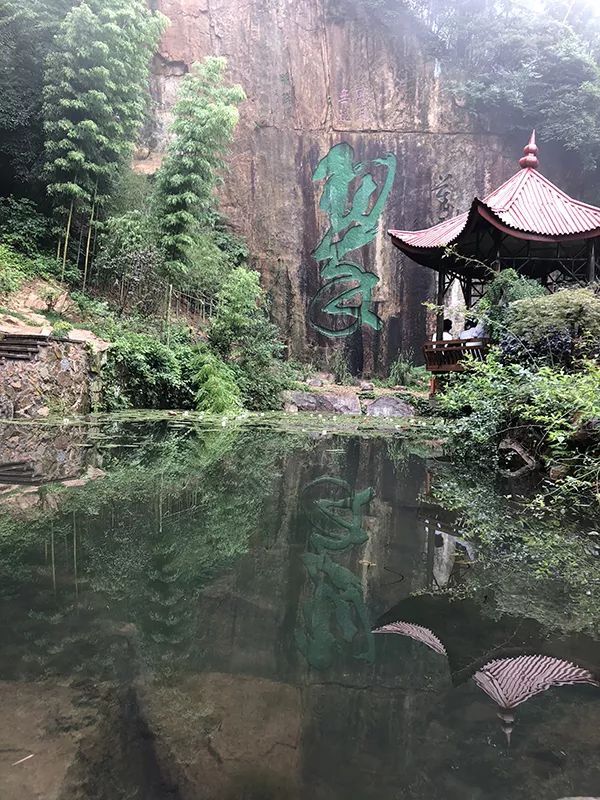 “滴翠潭”1980年利用廢棄采石場改造而成。鑿石成潭,因莫干山遍山翠竹,著名書法家君匋為此題寫了“翠”字,鐫刻于崖壁上,潭也因此得名。“翠”字高約十米,氣勢雄偉,神韻飄逸,被譽(yù)為“江南第一擘窠大字”。雨季山泉順高崖而下,呈珠狀,故名明珠瀑,崖面上還鐫刻了許多書法家書法,是莫干山的代表性景區(qū)。