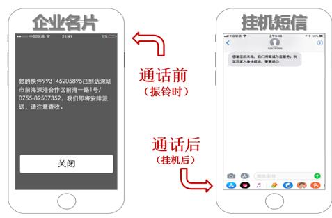 企業(yè)名片與掛機(jī)短信是以移動(dòng)通訊為基礎(chǔ)的短信息主動(dòng)推送業(yè)務(wù)。廣東聯(lián)通BPO業(yè)務(wù)平臺(tái)實(shí)時(shí)獲取手機(jī)號(hào)碼用戶的呼叫、掛機(jī)信令,呼叫時(shí)通過ussd技術(shù)推送閃信實(shí)現(xiàn)企業(yè)名片功能;掛機(jī)時(shí)后通過三網(wǎng)短信實(shí)現(xiàn)掛機(jī)短信業(yè)務(wù)。(有平臺(tái)的固話可以三網(wǎng))