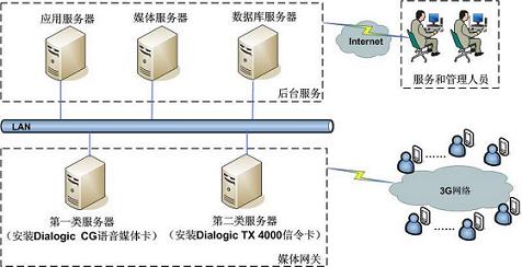 科大訊飛基于全球領先的智能語音技術并與Dialogic和合作,采用了其CG及TX系列產(chǎn)品打造了"能聽會說"的3G視頻系統(tǒng)。該系統(tǒng)可以提供許多3G業(yè)務應用,例如:3G視頻IVVR(Interactive Voice and Video Response,交互式語音及視頻應答)、移動電視、視頻點播、網(wǎng)絡KTV、語音查詢、語音短信等。該系統(tǒng)在結構方面主要包括兩大部分:第一部分是媒體網(wǎng)關,第二部分是后臺服務。