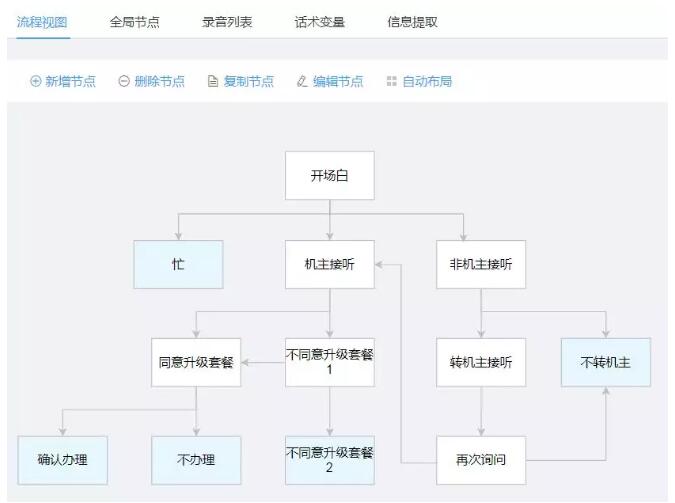 智能語音外呼機器人如何做外呼業(yè)務呢?以4G升5G套餐推廣為例,用可視化的編輯器,編輯外呼流程: