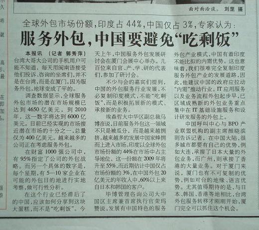 在這個行業(yè)已經(jīng)滯后了的中國,應(yīng)該如何分享到這塊大蛋糕,而不是“吃剩飯”。今天上午,中國服務(wù)外包發(fā)展研討會在廈門會展中心舉辦。幾百位來自官、產(chǎn)、學(xué)、研的代表們,參加了研討會。