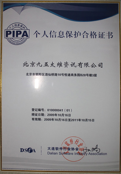 51Callcenter 1月22日?qǐng)?bào)道:日前,北京九五太維資訊有限公司正式通過(guò)PIPA認(rèn)證,據(jù)51Callcenter記者葉東了解:此系北京地區(qū)第一家通過(guò)“個(gè)人信息保護(hù)評(píng)價(jià)“認(rèn)證的公司。認(rèn)證編號(hào)為:010000041(01)個(gè)人信息保護(hù)評(píng)價(jià)(Personal information protection assessment 縮寫(xiě):PIPA”組織現(xiàn)場(chǎng)和文本審核。并經(jīng)PIPA網(wǎng)站公示于10月18日取得正式證書(shū)。