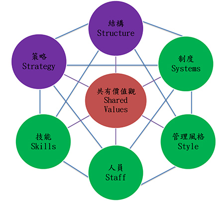 筆者建議可實行麥肯钖7S模型評估呼叫中心的內(nèi)部核心能力。七要素(簡稱7S模型)包括結(jié)構(gòu)(Structure)、制度(Systems)、管理風(fēng)格(Style)、人員(Staff)、技能(Skills)、策略(Strategy)、共同價值觀(Shared Values)。在模型中,策略和結(jié)構(gòu)屬硬件,共有價值觀、制度、管理風(fēng)格、人員及技能皆屬軟件,軟硬件都同樣重要且相互依賴。杰出的企業(yè)能將此七個要素管理得當(dāng),組織的效率來自各個要素間的互動,彼此運(yùn)作發(fā)揮最大功效(如圖1)。