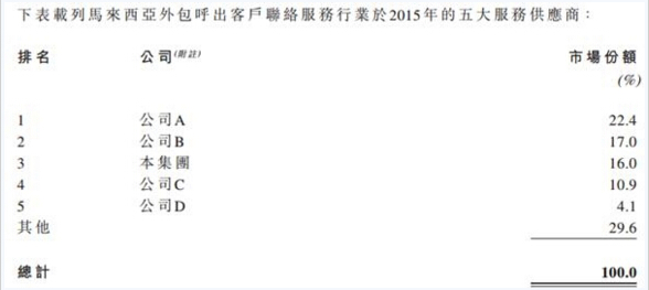 馬來西亞外呼業(yè)同行眾多,競爭激烈,據(jù)弗若斯特沙利文報(bào)告,2015年外包呼出客戶聯(lián)絡(luò)服務(wù)行業(yè)約有200家公司,但主要集中在五大企業(yè),五大企業(yè)共占市場份額70.4%,就2015年收入而言,UTS Marketing為第三大企業(yè),占市場份額的16%。此外,行業(yè)復(fù)合增長率為10%(2010至2015年按行業(yè)收入計(jì)算)。行業(yè)前五大公司市場占有率情況如下: