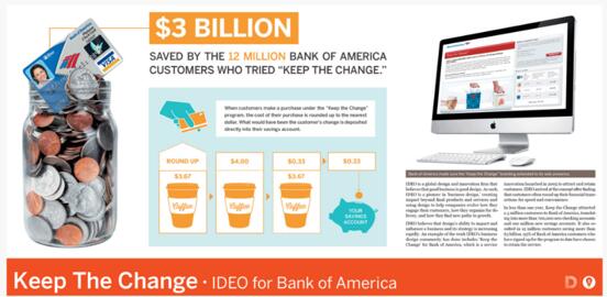 洞悉了這一痛點,一個由產(chǎn)品經(jīng)理、理財顧問、軟件工程師和運營專家組成的開發(fā)團隊歷經(jīng)20次會議之后, 推出了一項創(chuàng)新產(chǎn)品—keep the change零頭轉(zhuǎn)存。