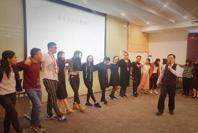 心理專家劉旭暉對歡樂的客服小伙伴點贊,他通過播放視頻短片來闡釋職場情緒帶來的嚴(yán)重后果,還舉不同場景的例子讓大家去體會不同的心理壓力。為了讓大家理解壓力的由來,還讓現(xiàn)場小伙伴圍成大圈來做互動小游戲,并分組進行小組合作。