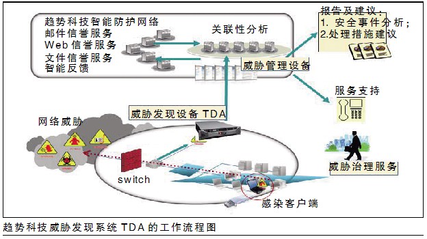 “TDA 的嚴格控制功能也彌補了江蘇移動呼叫中心之前部署防毒軟件的不足。比如 Web病毒、跨站木馬、視頻嵌入惡意軟件、非法流量、DNS劫持等尚未形成交叉感染的潛在威脅,在我們應用TDA之后,就可以從海量的數據流中迅速找到被防火墻放過來的漏網之魚。”王先生補充說。