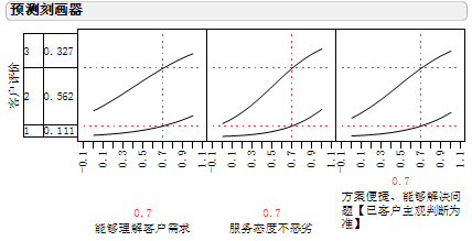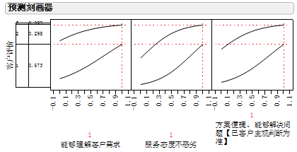 同時(shí)也可以使用JMP中特有的“刻畫器”工具進(jìn)行預(yù)估,它使我們能夠清楚的知道,這三項(xiàng)的質(zhì)檢成績(jī)對(duì)于滿意度的影響情況。