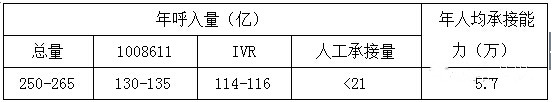 從目前全國話務情況來估算,2015年全年呼入量應在250—265億左右。其中10086自動臺承接大約是130億左右的體量,約占49%,1008611承接量大約是114或116億左右,約占43%,人工承接量不會超過21億,約占8%,人均年接話量按較為保守的水平估算大約5.7萬。如下表: