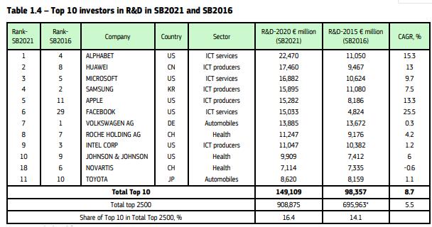 歐盟統(tǒng)計(jì)的2020/21年度研發(fā)投入前十企業(yè)中,谷歌母公司Alphabet以224.7億歐元位居第一,華為公司以174.6億歐元排名第二,超過第四名的三星(159億歐元)、排名第五的蘋果公司(152.8億歐元)、排名第九的英特爾(110.5億歐元)。