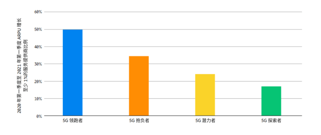 而相較之下,只有34%的抱負(fù)者、24%的潛力者和17%的探索者能夠見(jiàn)證ARPU的正向發(fā)展。雖然這不光是5G帶來(lái)的結(jié)果,但就5G領(lǐng)跑者而言,ARPU的提升主要?dú)w功于成功將用戶(hù)轉(zhuǎn)移到高級(jí)5G方案。