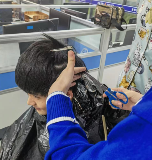 經(jīng)歷50多天的封閉,男孩子的頭發(fā)長了。拿著剪刀和用垃圾袋自制的剪發(fā)圍布,逼著女孩們給自己剪頭發(fā)。還笑稱:“不要偶像包袱了,別給我剪禿了就行。”