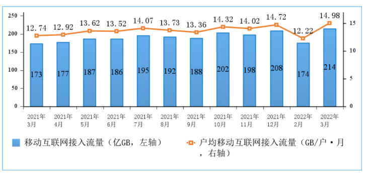 移動互聯(lián)網(wǎng)流量較快增長,3月DOU值創(chuàng)新高。一季度,移動互聯(lián)網(wǎng)累計(jì)接入流量達(dá)587億GB,同比增長21.8%。截至3月末,移動互聯(lián)網(wǎng)用戶數(shù)達(dá)14.4億戶,比上年末凈增1985萬戶。3月當(dāng)月戶均移動互聯(lián)網(wǎng)接入流量(DOU)達(dá)到14.98GB/戶·月,同比增長17.6%,比上年底高0.26GB/戶·月。