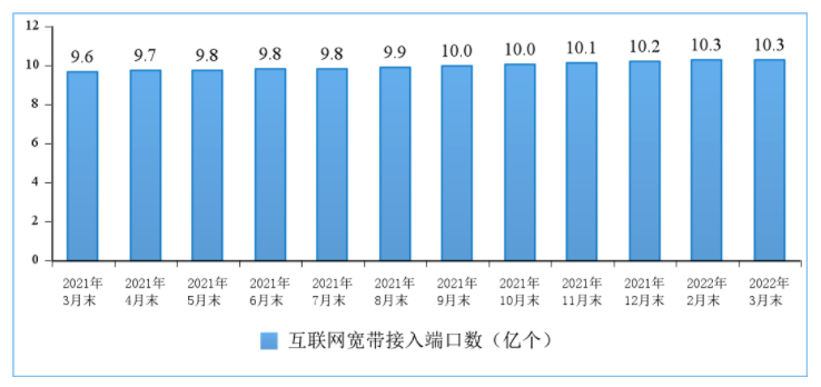 寬帶網(wǎng)絡(luò)加速建設(shè)。截至3月末,全國互聯(lián)網(wǎng)寬帶接入端口數(shù)量達(dá)10.3億個,比上年末凈增979萬個。其中,光纖接入(FTTH/O)端口達(dá)到9.7億個,比上年末凈增1384萬個,占比由上年末的94.3%提升到94.8%。截至3月末,具備千兆網(wǎng)絡(luò)服務(wù)能力的10G PON端口數(shù)達(dá)905萬個,比上年末凈增119萬個。