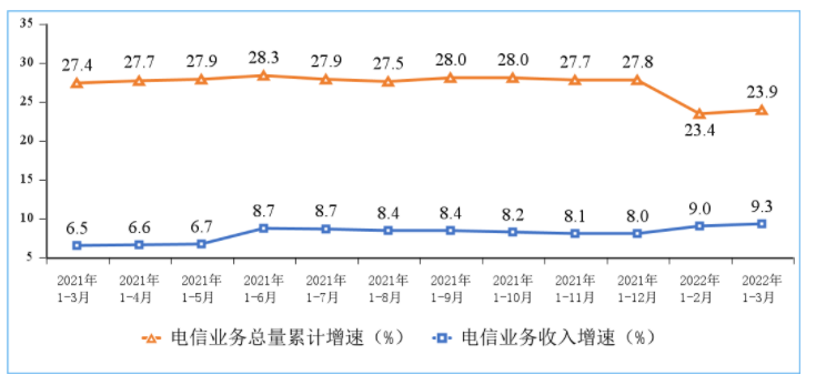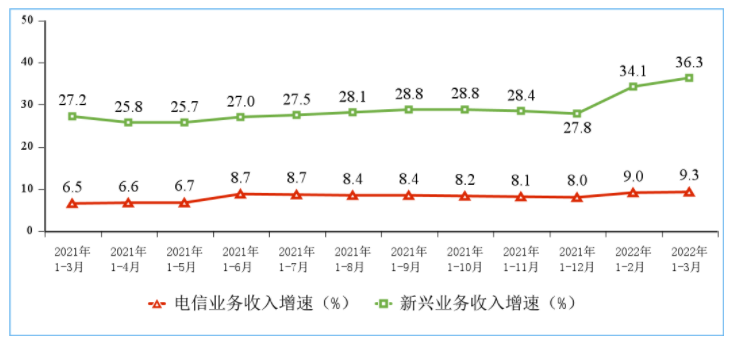 日前,工信部發(fā)布2022年一季度通信業(yè)經(jīng)濟(jì)運(yùn)行情況。文中顯示,一季度,通信業(yè)整體運(yùn)行平穩(wěn)向好。電信業(yè)務(wù)收入增速提升,電信業(yè)務(wù)總量較快增長;5G和千兆光網(wǎng)等新型基礎(chǔ)設(shè)施建設(shè)和應(yīng)用穩(wěn)步推進(jìn),通信供給能力不斷增強(qiáng);云計(jì)算等新興業(yè)務(wù)增勢突出,移動數(shù)據(jù)流量持續(xù)快速增長,行業(yè)發(fā)展新動能持續(xù)增強(qiáng)。