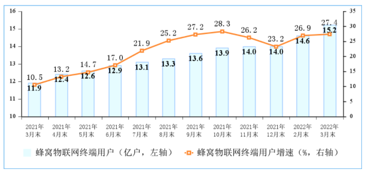 蜂窩物聯(lián)網(wǎng)用戶增長較快,IPTV用戶穩(wěn)步增加。截至3月末,三家基礎(chǔ)電信企業(yè)發(fā)展蜂窩物聯(lián)網(wǎng)終端用戶15.2億戶,比上年末凈增1.19億戶;蜂窩物聯(lián)網(wǎng)終端用戶規(guī)??焖俳咏苿与娫捰脩?,兩者規(guī)模差縮小至1.4億戶,占移動網(wǎng)終端連接數(shù)(包括移動電話用戶和蜂窩物聯(lián)網(wǎng)終端)的比重已達(dá)47.7%。IPTV(網(wǎng)絡(luò)電視)總用戶數(shù)達(dá)3.6億戶,比上年末凈增1121萬戶。