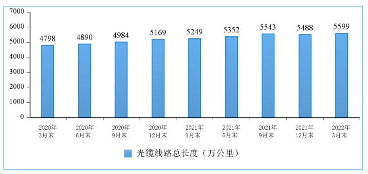 光纜線路總長度持續(xù)增加。截至3月末,全國光纜線路總長度達(dá)到5599萬公里,比上年末凈增111萬公里。其中接入網(wǎng)光纜、本地網(wǎng)中繼光纜和長途光纜線路所占比重分別為65.1%、32.8%和2.1%,接入網(wǎng)光纜比重同比提高2.5個百分點(diǎn)。