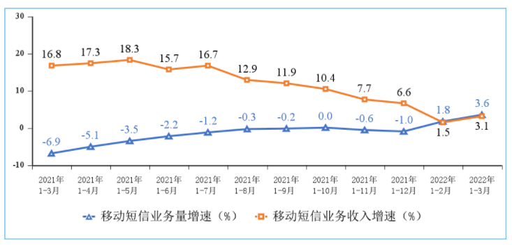 移動電話通話量低速增長,移動短信業(yè)務(wù)量收均增長。一季度,移動電話去話通話時(shí)長完成5445億分鐘,同比增長1.4%;固定電話主叫通話時(shí)長完成197億分鐘,同比下降12.8%。一季度,全國移動短信業(yè)務(wù)量同比增長3.6%;移動短信業(yè)務(wù)收入同比增長3.1%。