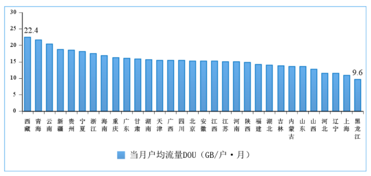 東部地區(qū)移動互聯(lián)網(wǎng)接入流量增速領(lǐng)先。一季度,東、中、西部和東北地區(qū)移動互聯(lián)網(wǎng)接入流量分別達(dá)到253億GB、131億GB、173億GB和30.2億GB,同比增長24.1%、22.3%、19.3%和14.9%,東部地區(qū)增速領(lǐng)先全國。西藏、青海和云南3省份的3月戶均移動互聯(lián)網(wǎng)接入流量(DOU)超過20GB/戶·月;各省DOU值最高值與最低值之差為12.8GB/戶·月。