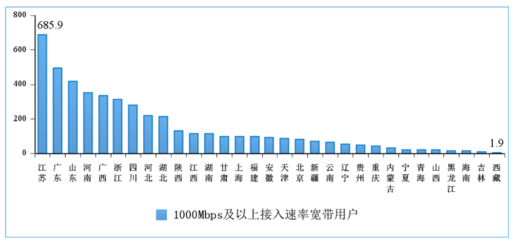 中部地區(qū)百兆以上用戶滲透率小幅領(lǐng)先。截至3月末,東、中、西和東北地區(qū)100Mbps及以上固定寬帶接入用戶滲透率分別為93%、94.2%、92.9%和93.4%,中部地區(qū)占比領(lǐng)先全國。東、中、西和東北地區(qū)1000Mbps及以上接入速率的寬帶接入用戶分別達(dá)2495萬、899萬、1127萬、75萬戶,其中江蘇、廣東和山東省居前列。