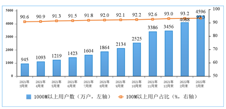 固定寬帶接入用戶規(guī)模穩(wěn)步增長,千兆用戶數(shù)持續(xù)擴(kuò)大。截至3月末,三家基礎(chǔ)電信企業(yè)的固定互聯(lián)網(wǎng)寬帶接入用戶總數(shù)達(dá)5.51億戶,比上年末凈增1513萬戶。其中,100Mbps及以上接入速率的固定互聯(lián)網(wǎng)寬帶接入用戶達(dá)5.14億戶,占總用戶數(shù)的93.3%,占比較上年末提升0.3個百分點(diǎn);1000Mbps及以上接入速率的固定互聯(lián)網(wǎng)寬帶接入用戶達(dá)4596萬戶,比上年末凈增1140萬戶。