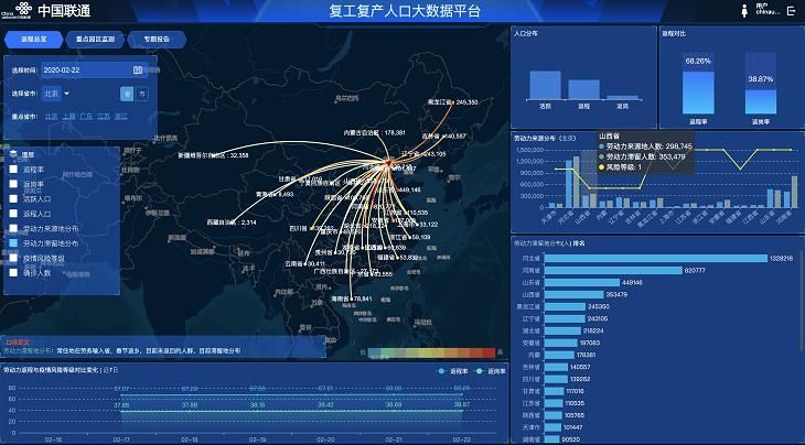 為了進(jìn)一步為促進(jìn)復(fù)工復(fù)產(chǎn)做好精準(zhǔn)有力支撐,中國聯(lián)通在做好防疫抗疫相關(guān)工作的前提下,依托自身海量大數(shù)據(jù)優(yōu)勢,以手機(jī)信令數(shù)據(jù)建立模型分析全國31省/直轄市、334個地級市的人口分布、人口流入流出、職住人口趨勢、勞動力人口的返城率、勞務(wù)輸出省人口流出趨勢等,以直觀的可視化平臺形式展現(xiàn)市、重點(diǎn)區(qū)域復(fù)工復(fù)產(chǎn)情況。