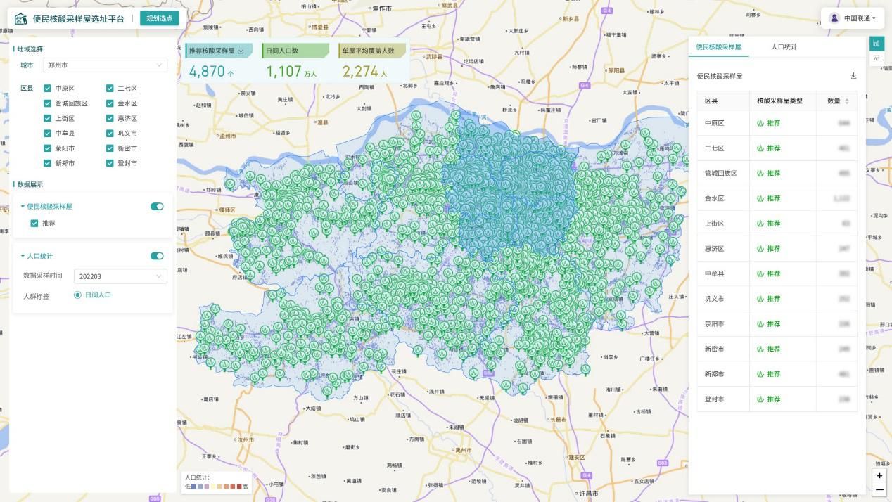5月23日,國家衛(wèi)健委提出,要完善常態(tài)化疫情監(jiān)測機(jī)制,省會和千萬級人口以上城市建立步行15分鐘核酸采樣圈,方便群眾就近就便進(jìn)行核酸采樣。中國聯(lián)通積極響應(yīng)國家號召,搭建便民核酸采樣屋智能選址平臺,支撐防疫部門根據(jù)地方財政及居民數(shù)量,合理規(guī)劃建設(shè)便民核酸采樣屋數(shù)量及空間分布,不僅方便市民進(jìn)行核酸檢測,同時又避免了醫(yī)療機(jī)構(gòu)資源擠占。
