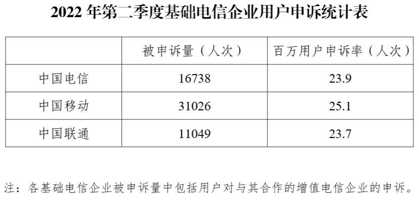 從2022年第二季度基礎(chǔ)電信企業(yè)用戶申訴統(tǒng)計看,中國移動被申訴量和申訴率最高,分別為31026人次和25.1人次/每百萬用戶。