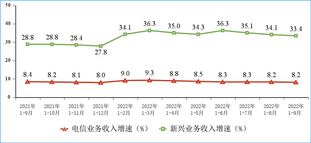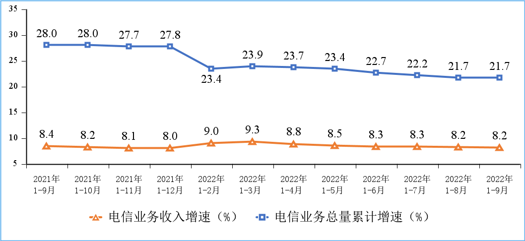 今日,工信部發(fā)布《2022年前三季度通信業(yè)經(jīng)濟運行情況》。報告顯示,電信業(yè)務收入實現(xiàn)穩(wěn)步增長,電信業(yè)務總量保持兩位數(shù)增幅。前三季度,電信業(yè)務收入累計完成11971億元,同比增長8.2%,按照上年不變價計算的電信業(yè)務總量同比增長21.7%,增速均較上月持平。