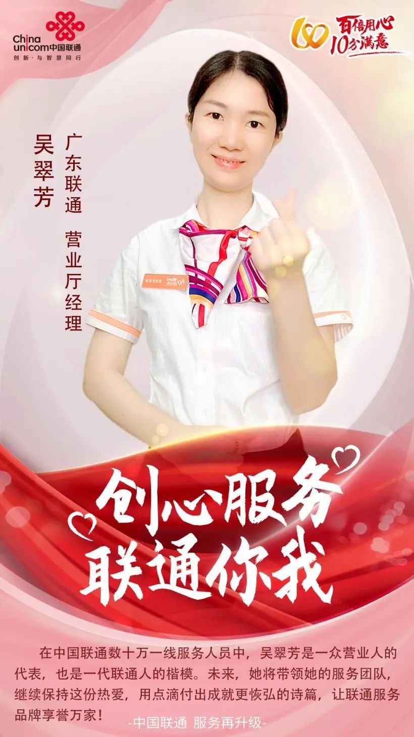 在中國(guó)聯(lián)通數(shù)十萬(wàn)一線服務(wù)人員中,吳翠芳是一眾營(yíng)業(yè)人的代表,也是一代聯(lián)通人的楷模。未來(lái),她將帶領(lǐng)她的服務(wù)團(tuán)隊(duì),繼續(xù)保持這份熱愛(ài),用點(diǎn)滴付出成就更恢弘的詩(shī)篇,讓聯(lián)通服務(wù)品牌享譽(yù)萬(wàn)家!