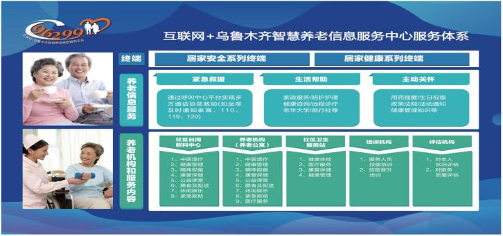 烏魯木齊市作為“智慧養(yǎng)老信息服務平臺+一鍵通手機”服務的第一批試點,為了能夠給老人提供更加快速便捷的服務,開通了96299養(yǎng)老服務熱線,建設了專用呼叫中心,將電話、i-TV、各類物聯(lián)網(wǎng)產(chǎn)品等接入智慧養(yǎng)老信息服務平臺,老人只需按下sos鍵即可撥打熱線,直達智慧養(yǎng)老信息服務平臺呼叫中心,平臺的24小時熱線96299可在第一時間接收到老人的訊息,為老人提供助餐、助潔、助醫(yī)等服務。