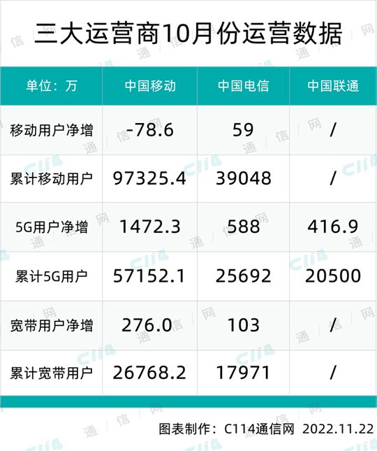 根據(jù)中國移動公布的數(shù)據(jù)顯示,截至2022年10月,移動業(yè)務(wù)客戶總數(shù)97325.4萬戶,上月凈增客戶數(shù)為-78.6萬戶,本年累計凈增客戶數(shù)1636.2萬戶,5G套餐客戶數(shù)57152.1萬戶;有線寬帶業(yè)務(wù)方面,客戶總數(shù)26768.2萬戶,上月凈增客戶數(shù)276.0萬戶,本年累計凈增客戶數(shù)2757.6萬戶。