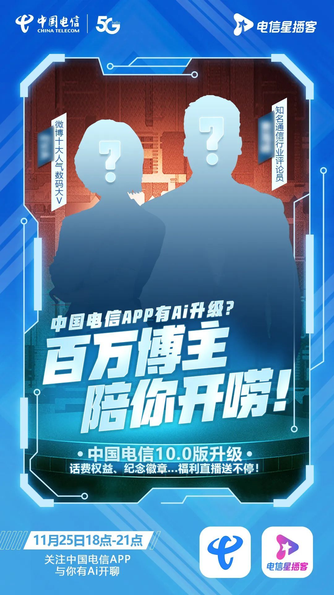 據(jù)悉,11月25日18點(diǎn)-21點(diǎn),中國(guó)電信官方APP 10.0版將在電信星播客以“‘升級(jí)’美好生活,有AI全搞定”為主題進(jìn)行直播發(fā)版,通過(guò)線上直播的形式與廣大用戶正式見(jiàn)面;而為了幫助大家更好地理解升級(jí)后的APP,中國(guó)電信還請(qǐng)來(lái)了兩位“百萬(wàn)粉”級(jí)別的業(yè)內(nèi)大咖,用專業(yè)的視角和獨(dú)到的見(jiàn)解,對(duì)中國(guó)電信官方APP 10.0版進(jìn)行“拆解”。